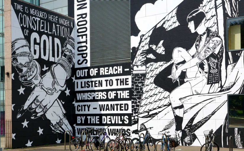 En parcourant les différentes œuvres contemporaines, je me suis arrêté sur une œuvre en particulier : Almost Alone, Truth and lies réalisé par le Patrick McNeil et Patrick Miller du collectif FAILE basé à Brooklyn en 2016. Une œuvre du Street Art qui associe différents éléments (scènes, texte, image) dans des supports rectangulaires colorés différemment. Ces artistes aiment ajouter des symboles de leur art, ici ils ont choisi d’ajouter une tête de chien à l’homme.
