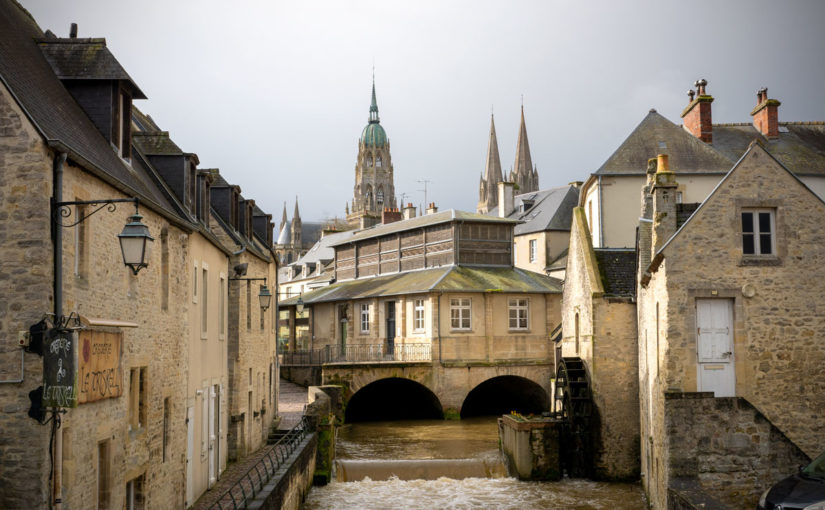 J’aime beaucoup me promener dans le centre historique de Bayeux, le long de l’Aure, la rivière qui traverse la ville. Le cadre est tellement charmant avec ses petites maisons en pierres et ses moulins. En amont, ils servaient au Moyen-Âge à moudre les céréales. En aval, ils servaient aux tanneries, rejetant alors les eaux usées. Depuis là, on s’offre un magnifique point de vue sur l’ancienne Halle aux poissons qu’occupe désormais l’office du tourisme avec la cathédrale en arrière-plan.